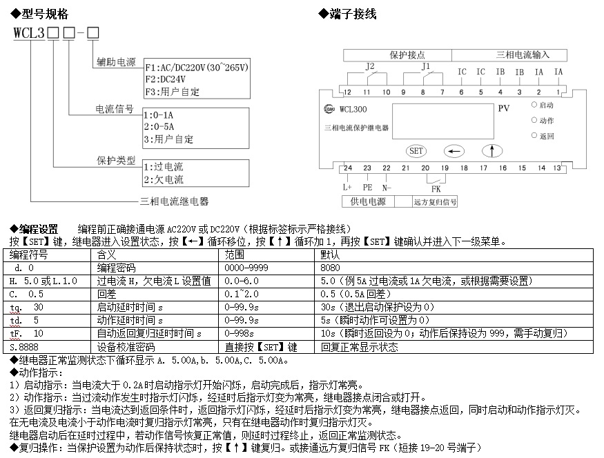WCL300三相電流繼電器,適用于高壓35kv,10kv或低壓400v線路、電動(dòng)機(jī)及其他用電設(shè)備,作為三相電流檢測(cè)及控制設(shè)備。且具備啟動(dòng)延時(shí)(用作電動(dòng)機(jī)保護(hù))、延時(shí)動(dòng)作、返回延時(shí)等功能,檢測(cè)精度高,是高低壓系統(tǒng)及電動(dòng)機(jī)簡(jiǎn)便可靠的三相電流繼電保護(hù)。
