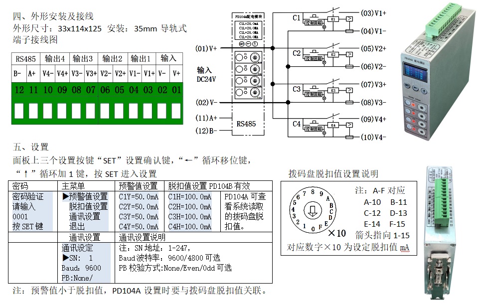 4,模塊通過(guò)面板上“SET”設(shè)置鍵、“←”循環(huán)移位鍵、“↑”循環(huán)加1鍵。在液晶屏上分別設(shè)置4路預(yù)警電流值,脫扣電流值(PD104B有效),當(dāng)某路電流超過(guò)預(yù)警值,該路指示燈閃爍。當(dāng)某路電流超過(guò)脫扣值(PD104B有效),該路指示燈滅,回路被自動(dòng)斷開(kāi),重新接通該回路需手動(dòng)按投入鍵。