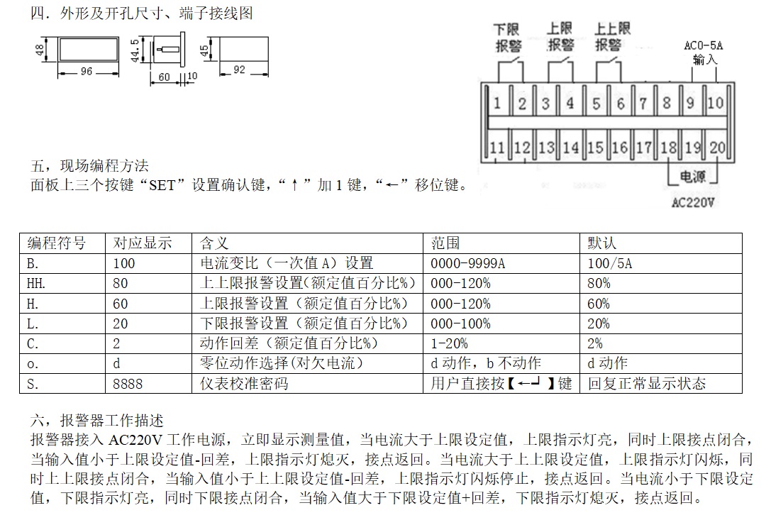 CAKJ494I(U)-3K交流電流電壓報(bào)警器適用于交流系統(tǒng)電壓電流測量顯示及報(bào)警。報(bào)警器采用高速AD轉(zhuǎn)換器及微處理器,對(duì)測量電流或電壓高速采樣實(shí)現(xiàn)過、低電流或電壓報(bào)警,報(bào)警輸方式采用繼電器接點(diǎn)輸出及指示LED。