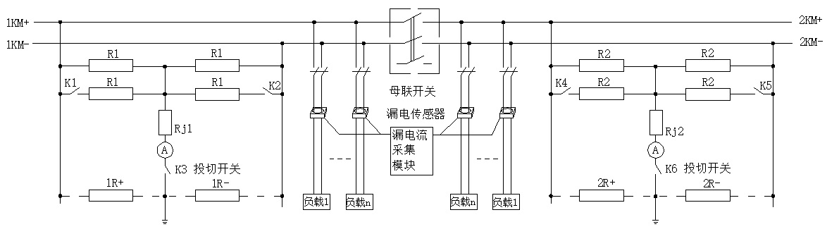 通過母線橋式比較電路及乒乓輔助判斷電路,準(zhǔn)確計(jì)算出直流母線正負(fù)極對(duì)地絕緣電阻(單母線絕緣降低或雙母線平衡絕緣降低),支路霍爾傳感器漏電流監(jiān)測(cè),并給出不同信號(hào),為直流系統(tǒng)故障分析提供依據(jù)。測(cè)量回路投入或退出可遙控投切(K3,K6)。