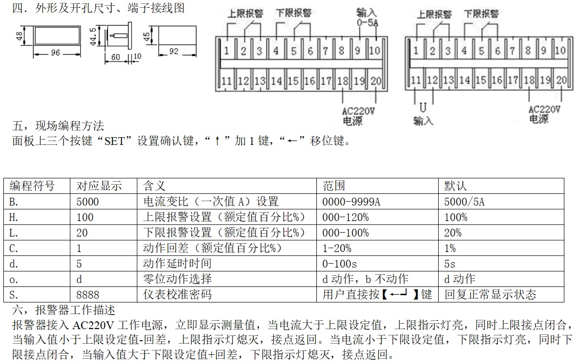 參數(shù):測量電流或電壓,報警輸出