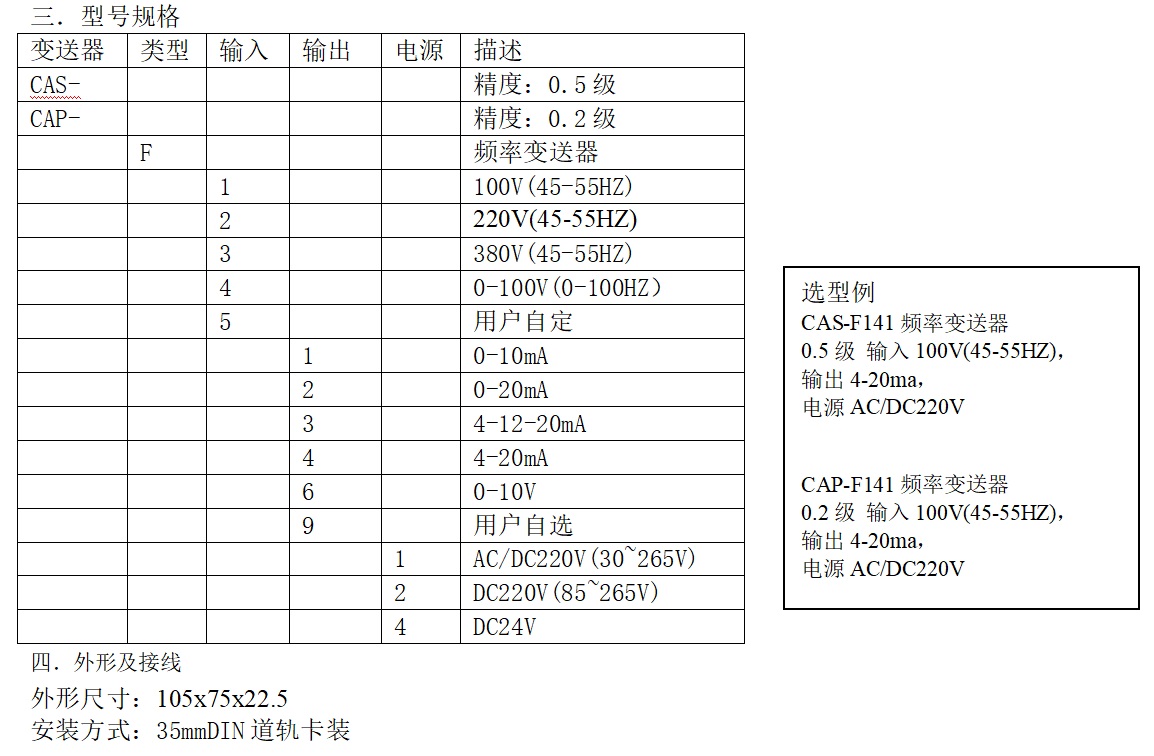 CAS系列頻率變送器是將被測電壓頻率信號轉換成按線性比例輸出直流電流、電壓并隔離的設備,配以相應的指示儀表或裝置是電力系統、遠動裝置、自動化控制系統等可選的模擬量采集模塊。